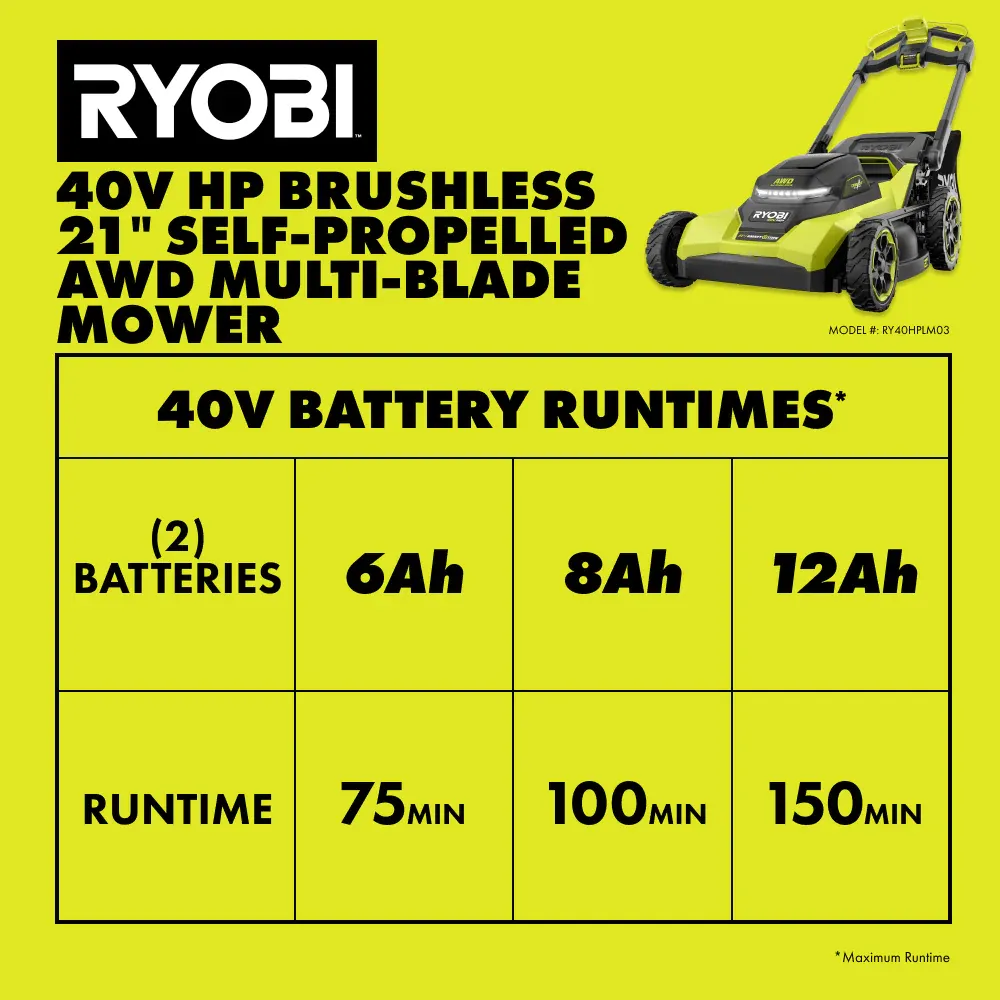 The RYOBI 40V HP Brushless 21” Self-Propelled All-Wheel Drive Multi-Blade Mower delivers more power than a 196cc gas mower, making it a true gas replacement. The (2) 40V 6Ah batteries give you up to 75 minutes of runtime for easily tackling up to 3/4 acre while utilizing two active battery ports. RYOBI 40V HP Technology utilizes a brushless motor & advanced electronics that automatically react to mowing conditions by increasing the blade speed to eliminate bogging down & powering through the toughest cut. Experience industry’s best 3-in-1 cut performance with the CROSS CUT™ Multi-Blade System, allowing for less clumping when mulching, further & more even dispersal when side discharging, & when bagging the fine clippings fill from back to front to maximize space for less bag changes. The ALL-WHEEL DRIVE system gives you ultimate maneuverability & control in any terrain by providing full power to all four wheels, while SMART TREK™ self-propelled technology allows you to effortlessly adapt the mower's speed to your pace, so you can finish the job quickly, effortlessly, & with less fatigue. CUT COMMAND CENTER™ helps you monitor runtime & blade life, activate turbo mode & lights, and adjust drive type & self-propelled speed at your fingertips. Achieve an extra boost of power with turbo mode. Best of all, it is part of the RYOBI 40V system where any 40V battery works with any 40V product. Backed by the 5-year manufacturer’s tool warranty and 3-year manufacturer’s battery warranty.