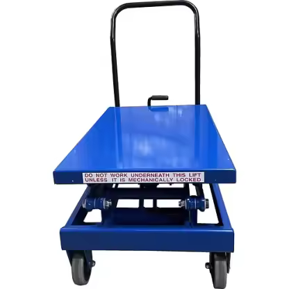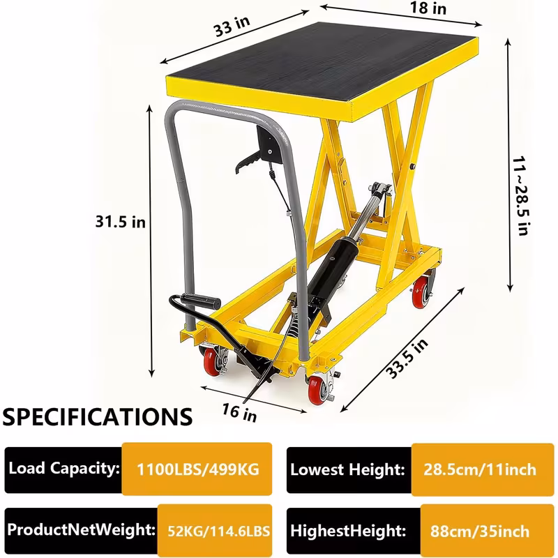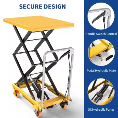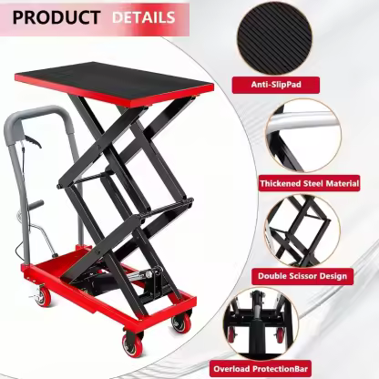 This industrial-grade hydraulic lift cart features a robust double-scissor mechanism and a non-slip platform, offering a maximum lifting height of 50 inches. Designed for demanding material handling, assembly, and workshop applications, it combines substantial lifting capacity with smooth mobility through four swivel casters—making it ideal for transporting, positioning, and raising heavy equipment, machinery, and palletized loads.